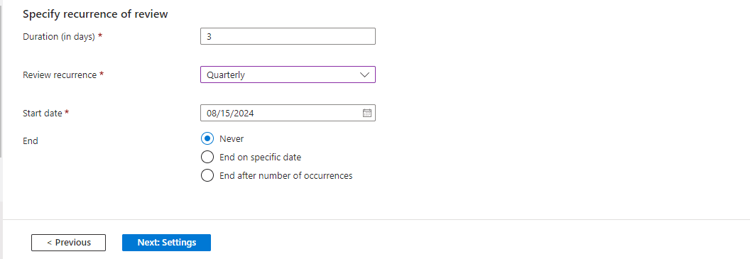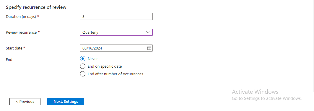 Under ‘Specify recurrence of review’, I entered 3 as the ‘Duration (in days)’, indicating the time period available to complete the access review. I also selected ‘Quarterly’ as the review recurrence to ensure that only authorized individuals have access to the Security Resources group. Furthermore, I set August 15, 2024, as the ‘Start Date’ and checked the ‘Never’ button as the end option, implying that the access review will continue to occur every quarter indefinitely.