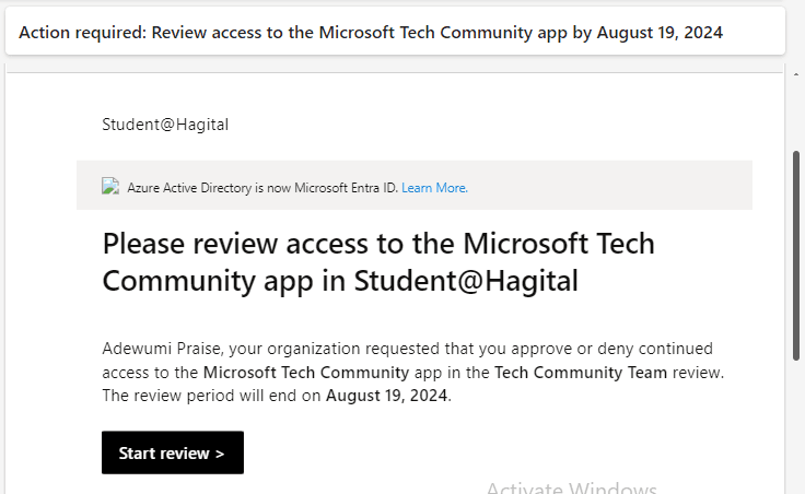 - I click on “Start Review” to begin the review process after receiving an email in my Outlook email account, which requests me to approve or deny users’ continued access to the Microsoft Tech Community application within the Tech Community Team Group.