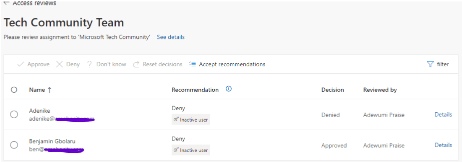 - I select “Deny” for employees who have left the Tech Community team or are no longer active.