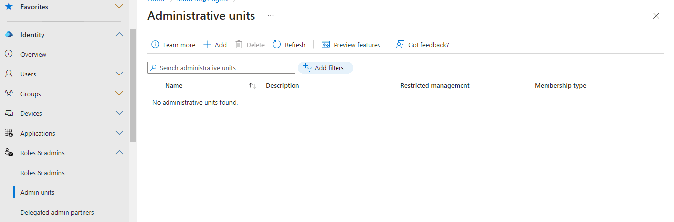 - I navigated to “Administrative Units” and clicked “Add” in order to create a new administrative unit.