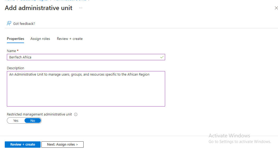 - I named the unit “BenTech Africa” and added a description. I also ensured that the “Restricted management administrative unit” option was set to “No” for the administrative unit, allowing delegated users to perform their administrative tasks.