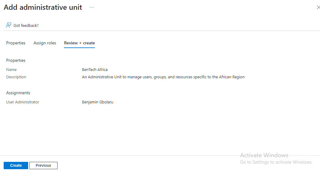 - I assigned the User Administrator role to the new Admin Unit for Benjamin Gbolaru (myself). After that, I clicked on the create button.