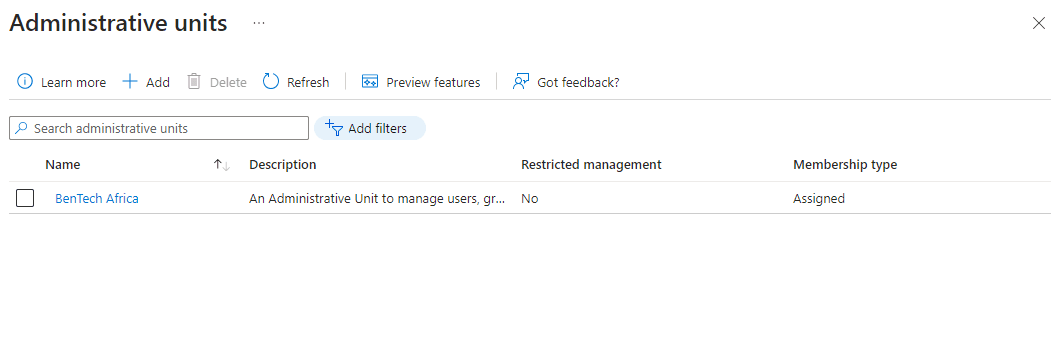 Using a scenario where BenTech Ltd., a global company, wants to delegate administration of their African offices’ resources and access to a regional IT team. To achieve this, they need to create an Administrative Unit to manage users, groups, and resources specific to the African region. Here are the steps to implement this scenario in Administrative Units in Microsoft Entra ID:
