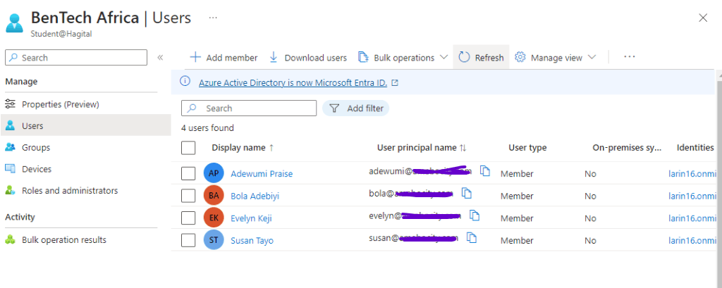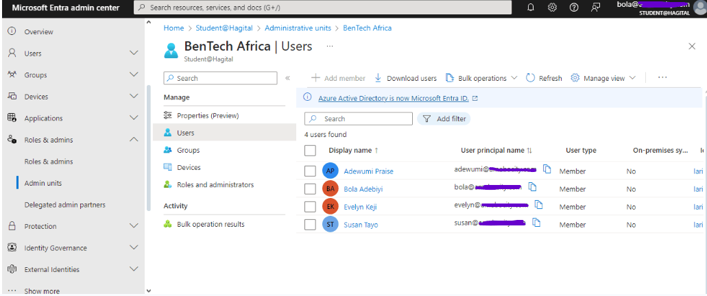 - After the BenTech Africa Admin Unit was successfully created, I then added four members to the Admin Unit.