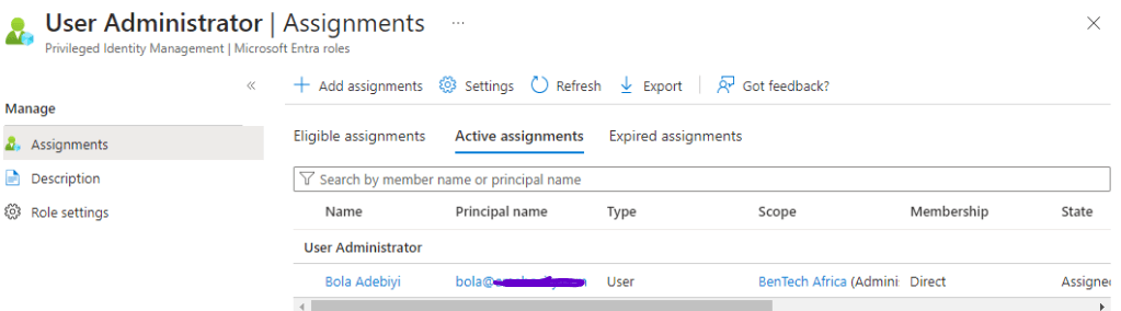 - After removing myself as the User Administrator, I assigned Bola Adebiyi, a member of the BenTech Africa Admin Unit and IT Team Leader for BenTech Africa, as the new User Administrator.