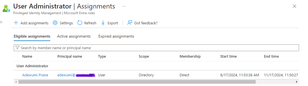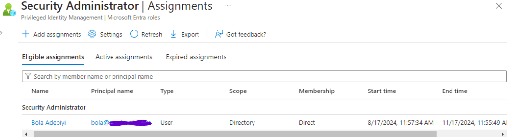 Under PIM, I clicked on “Microsoft Entra roles”, then clicked on “Assign eligibility”. I chose the “User Administrator” role and assigned Adewumi to it. I also selected the “Security Administrator” role and assigned Bola to it.
