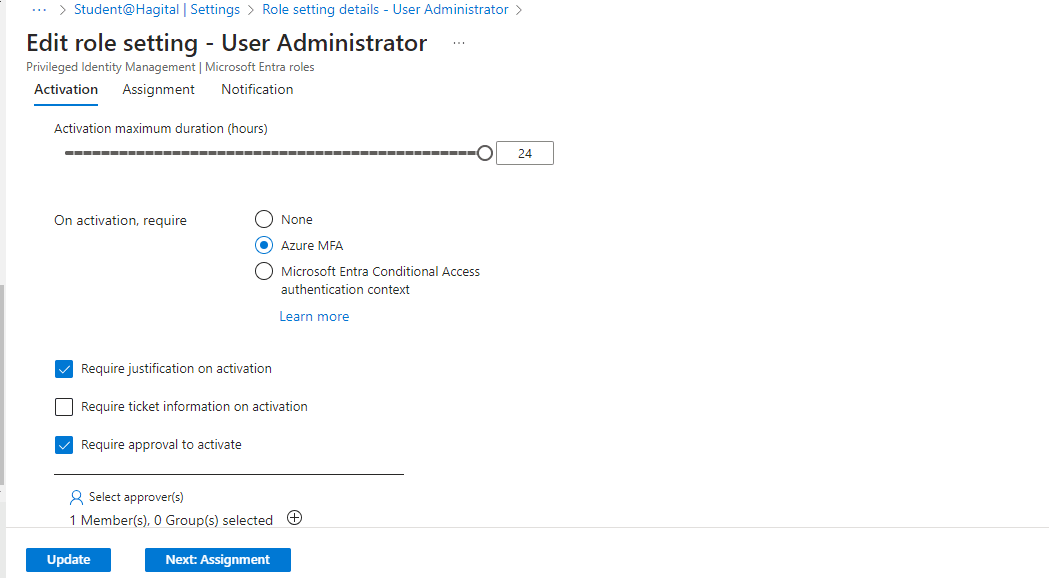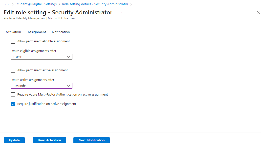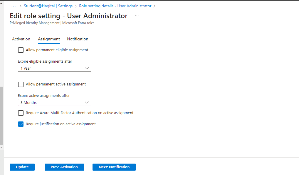 - Checked the box for “Require justification on active assignment”