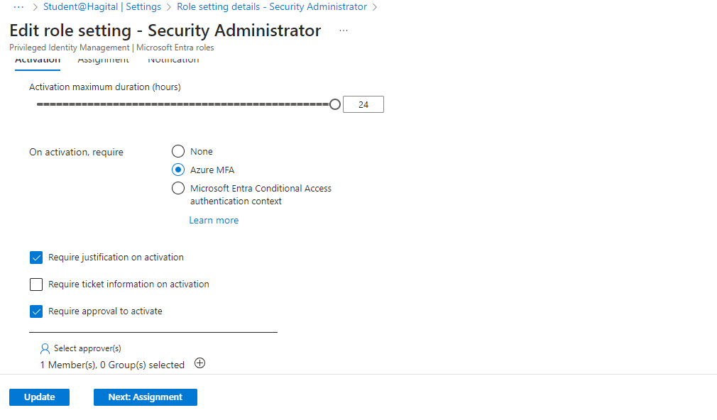- Set “On activation, require” to “Azure MFA”