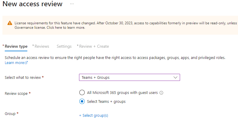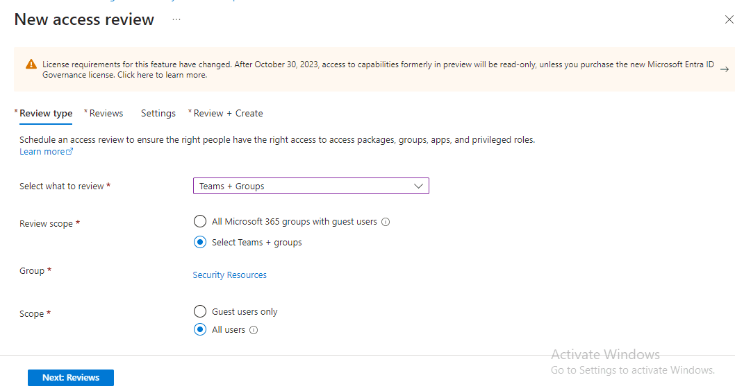 Step 2: Choosing Review Type and Scope I selected ‘Groups + Teams’ as the review type. I also selected ‘Select Teams + groups’ as the review scope and chose ‘Security Resources’. Then, I clicked ‘Select’. Next, I chose the scope as ‘All Users’ and clicked the ‘Next Review’ button to proceed to the next page.