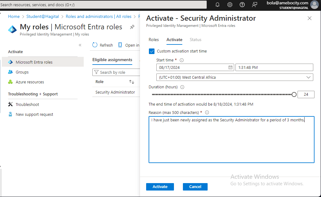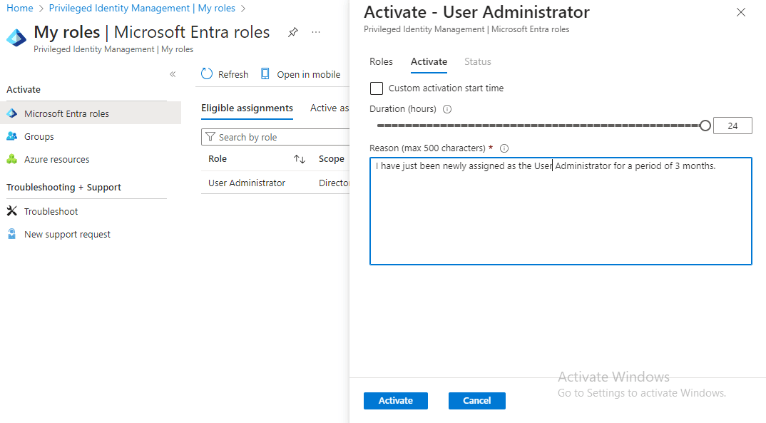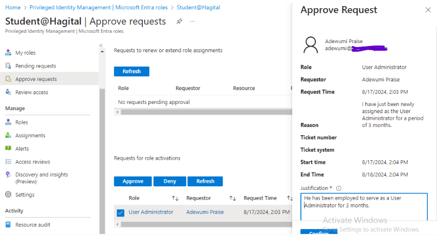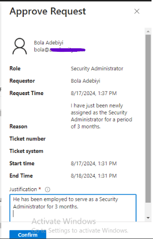 Adewumi also clicks on the “Activate” button and provides a reason: “I have just been newly assigned as the User Administrator for a period of 3 months.”