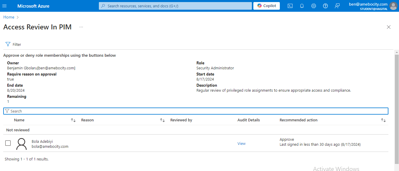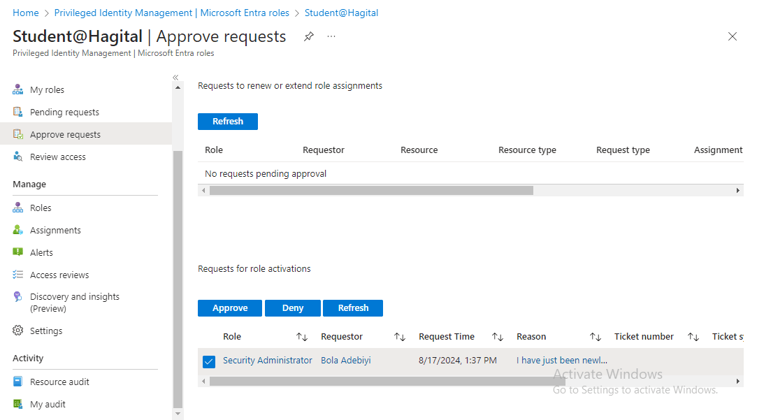 I then log in to the Entra Admin Center to approve Bola’s activation request.