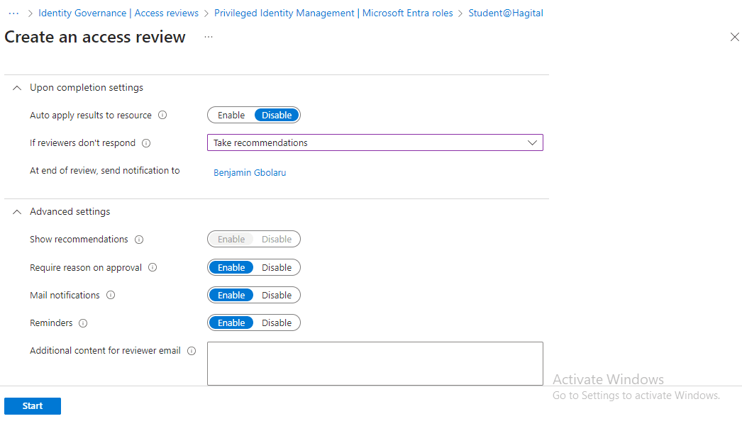 With these settings in place, I clicked ‘Start’ to initiate the Access Review process. See Screenshot Below.