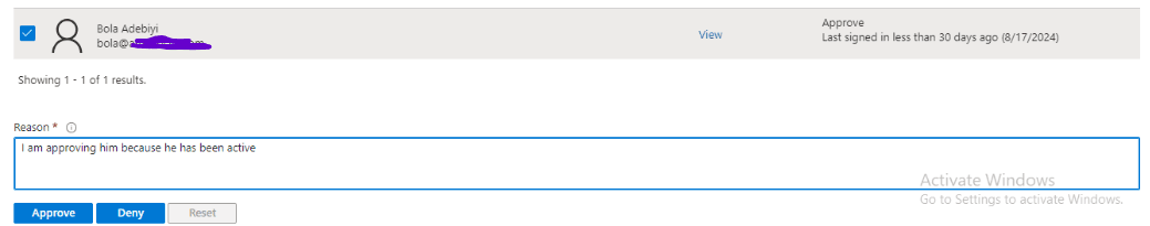 I then log in to the Entra Admin Center to approve Adewumi’s activation request.