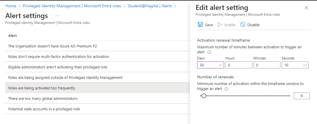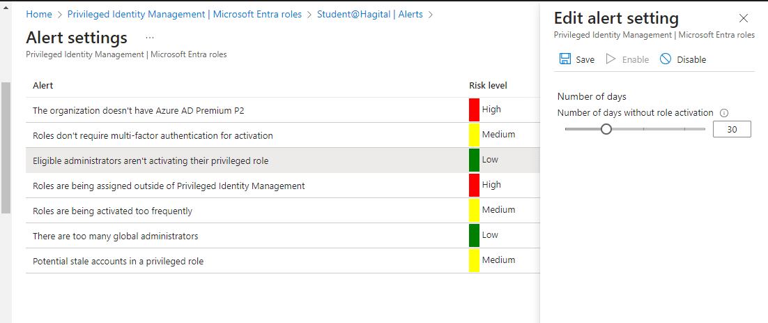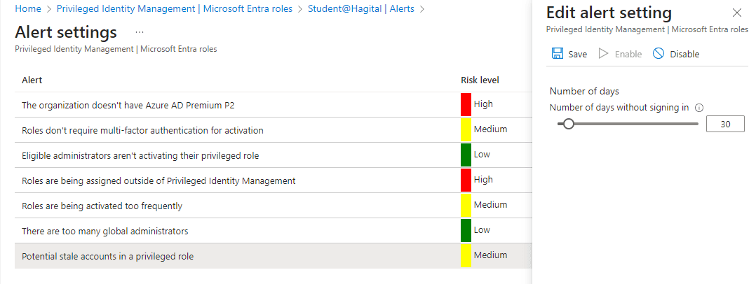 Inside PIM, I set up necessary alerts in order to stay aware of any potential security risks.