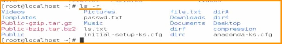 Type the command ls –r and press enter key to list files and Directories in reverse alphabetical order
