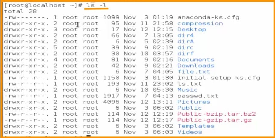 Type the command ls – l and press enter to list files and directories with details. You will be able to see permissions, User, Group, Size, Date modified, the file name in respective order.