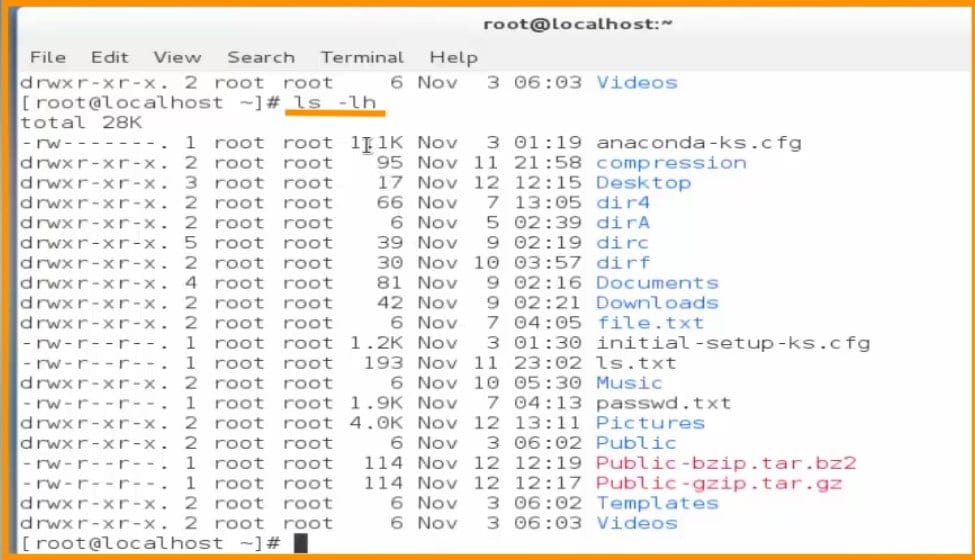 Type the command ls – lh, which is the same as before except that it specifies sizes in a clearer way I.e. if the file is KB it shows in KB.