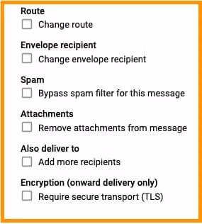 Now you can choose to route, Envelope recipient, Spam, remove attachments, deliver, Encryption by checking the respective boxes.