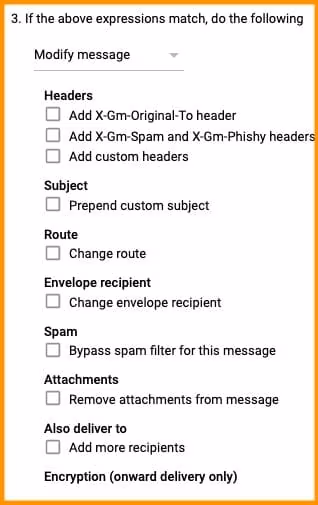 If you choose to modify the message, you can add Headers, prepend subject, change route, Remove attachments.