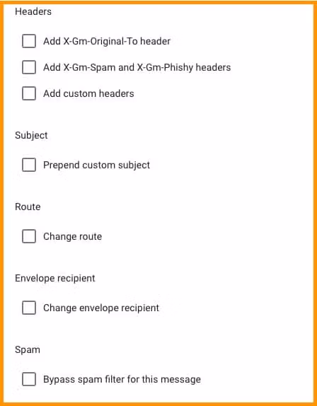 You can choose the modifications by selecting options below to Add headers, prepend Subject, Change route, Remove attachments etc.