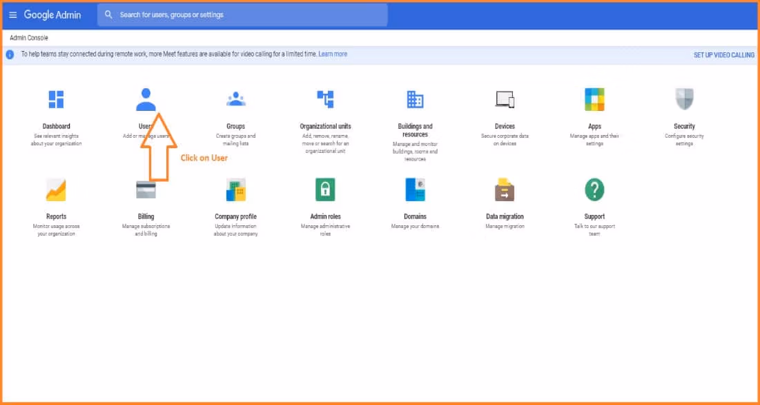 First, you have to log in to the G Suite admin console. Once you opened the dashboard click on “users”