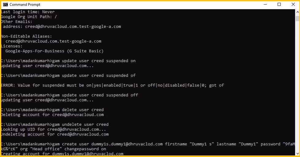 C:Usersmadankumarh> gam create user creed first name “Creed” last name “Bretton Smith” password “creed@12345”
